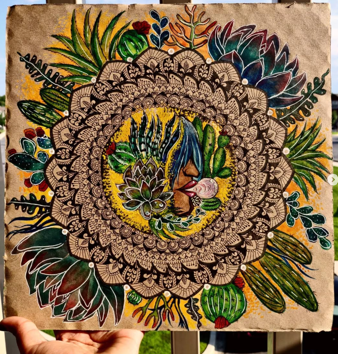 “Succulent”. 2020. Mixed media mandala on corrugated cardboard.