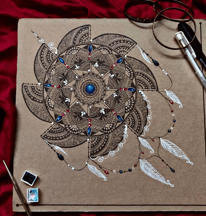 “Bejeweled”. 2020. Mixed media mandala on corrugated cardboard.
