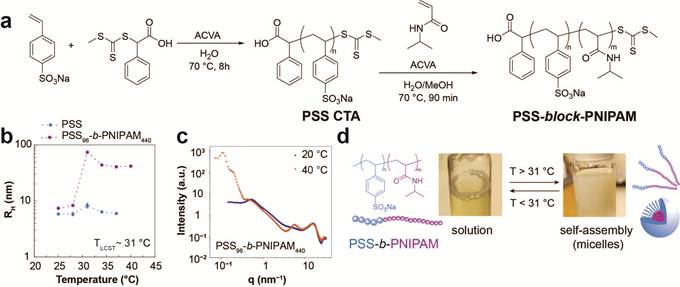 Thermo-responsive polyelectrolytes. a. Synthesis of PSS-block-PNIPAM, a thermo-responsive and conductive polyelectrolyte complex. b. Change in hydrodynamic radius as a function of temperature for PSS and PSS-b-PNIPAM. c. Change in intensity as a function of q, as observed by small angle x-ray scattering (SAXS). d. Schematic for micelle formation in PSS-b-PNIPAM.